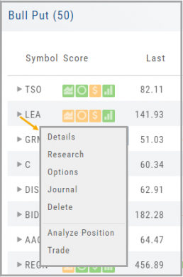 Any Strategy-specific options scan will have ‘Analyze’ and ‘Trade’ in the Action Icon Menu. You can click ‘Analyze’ to see the trade in the options chain. From there, you can Edit the structure or click ‘Trade’ to submit the trade to your to Brokerage Account and Journal.